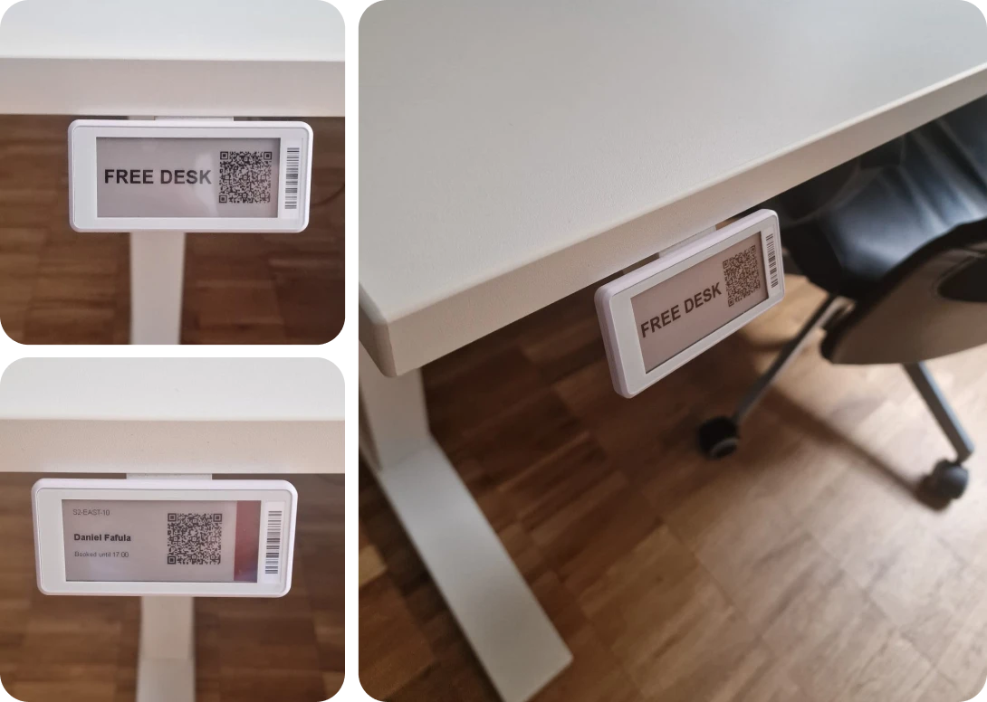 Grazie al display presente sulla postazione di lavoro è possibile visualizzare lo stato attuale di occupazione. È possibile vedere a colpo d'occhio chi ha prenotato la postazione di lavoro. È possibile prenotare le postazioni di lavoro disponibili anche direttamente in loco, utilizzando il codice QR visualizzato. Grazie alla tecnologia ePaper non hai bisogno di una connessione Internet.